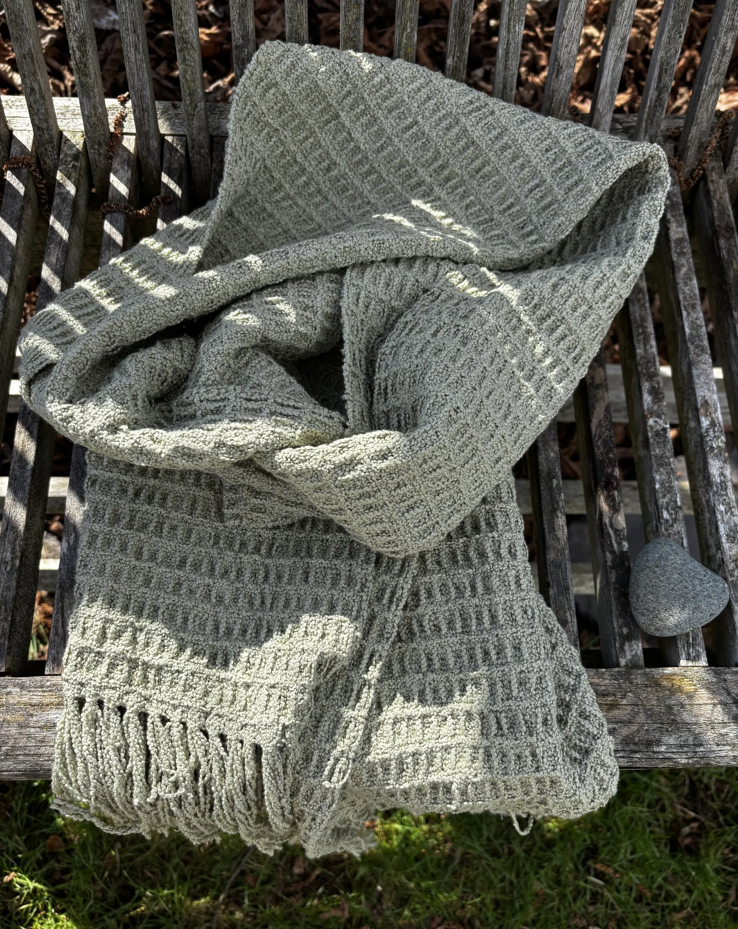 The final scarf: The perfect sage green with the lightness of a waffle weave.